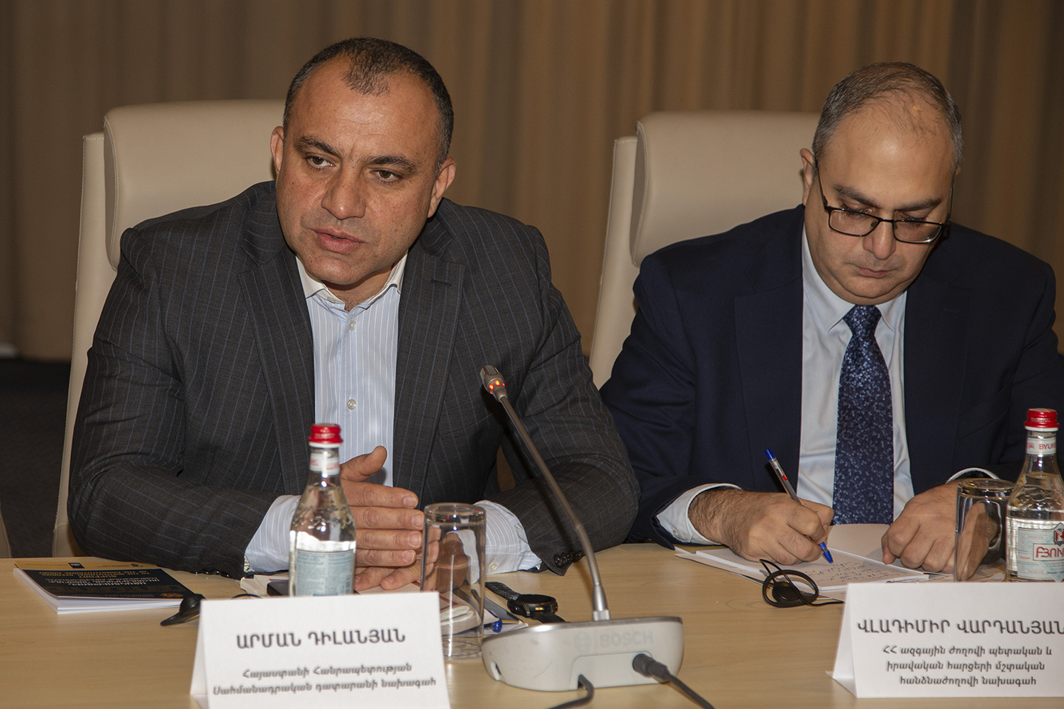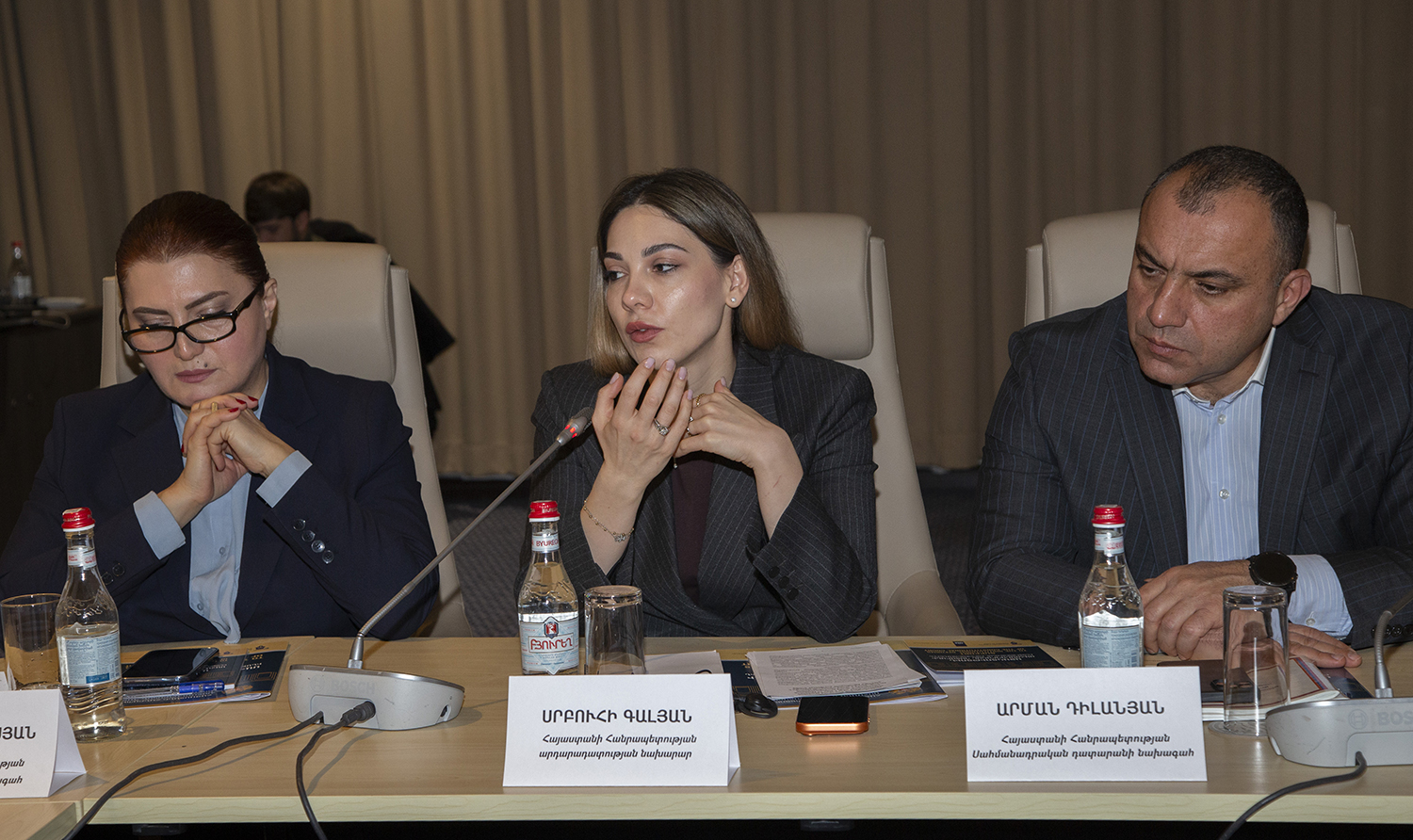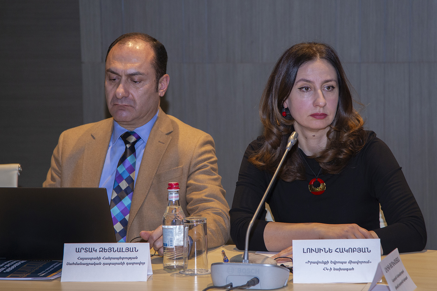 С докладами по вышеуказанным темам выступили: Заместитель Председателя Конституционного Суда РА Эдгар Шатирян, судьи Конституционного Суда РА Седа Сафарян, Давид Хачатурян и Артак Зейналян, член Высшего судебного совета РА Карен Туманян, судья Антикоррупционной палаты Кассационного суда РА Геворг Гезалян, министр юстиции РА Србуи Галян, Председатель Постоянной комиссии Национального Собрания РА по государственно-правовым вопросам Владимир Варданян, Председатель Постоянной комиссии Национального собрания РА по вопросам обороны и безопасности Андраник Кочарян, исполняющий обязанности Председателя Постоянной комиссии Национального собрания РА по защите прав человека и общественным вопросам Рустам Бакоян, председатель общественной организации “Ванадзорский офис Хельсинкской гражданской ассамблеи” Артур Сакунц, Директор Армянского института международных отношений и безопасности Степа Сафарян, президент общественной организации “Свободный гражданин” Овсеп Хуршудян, старший юрисконсульт общественной организации “Объединение Европа права” Тигран Егорян, председатель Конфедерации профсоюзов Армении Элен Манасерян.