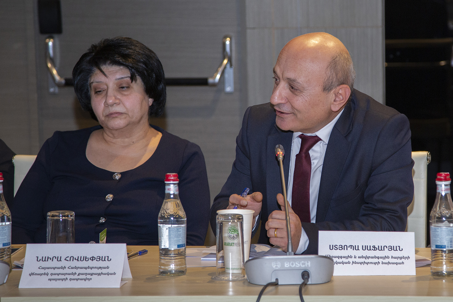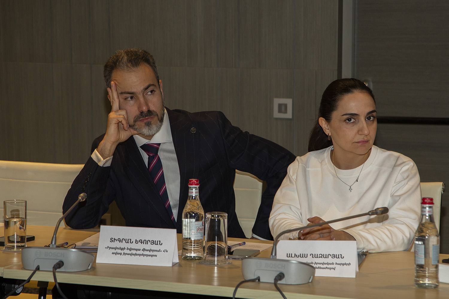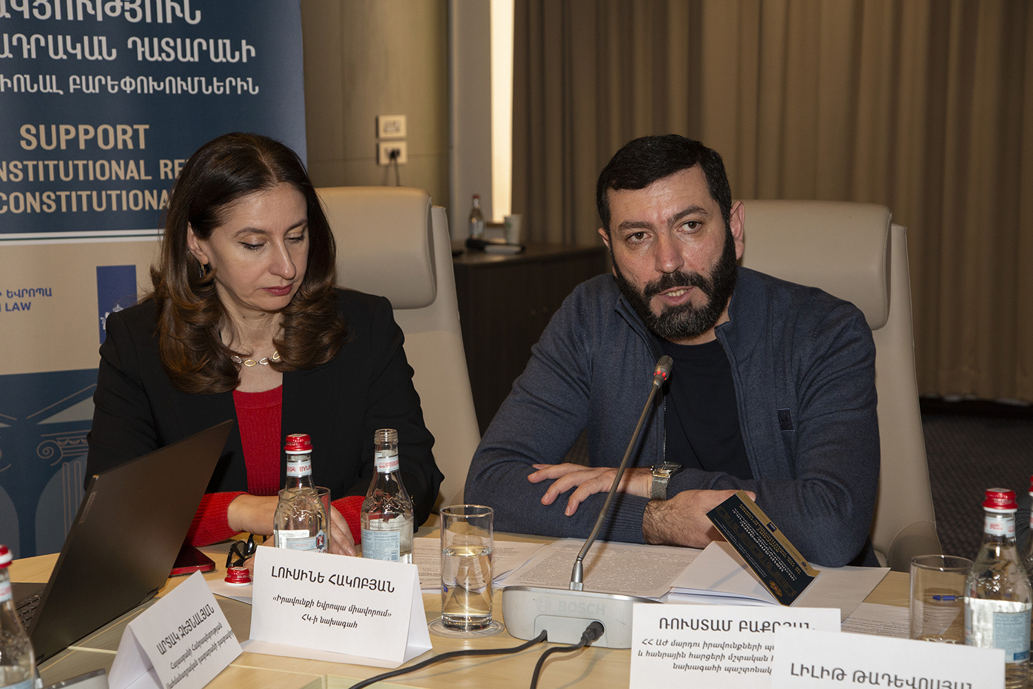 С докладами по вышеуказанным темам выступили: Заместитель Председателя Конституционного Суда РА Эдгар Шатирян, судьи Конституционного Суда РА Седа Сафарян, Давид Хачатурян и Артак Зейналян, член Высшего судебного совета РА Карен Туманян, судья Антикоррупционной палаты Кассационного суда РА Геворг Гезалян, министр юстиции РА Србуи Галян, Председатель Постоянной комиссии Национального Собрания РА по государственно-правовым вопросам Владимир Варданян, Председатель Постоянной комиссии Национального собрания РА по вопросам обороны и безопасности Андраник Кочарян, исполняющий обязанности Председателя Постоянной комиссии Национального собрания РА по защите прав человека и общественным вопросам Рустам Бакоян, председатель общественной организации “Ванадзорский офис Хельсинкской гражданской ассамблеи” Артур Сакунц, Директор Армянского института международных отношений и безопасности Степа Сафарян, президент общественной организации “Свободный гражданин” Овсеп Хуршудян, старший юрисконсульт общественной организации “Объединение Европа права” Тигран Егорян, председатель Конфедерации профсоюзов Армении Элен Манасерян.